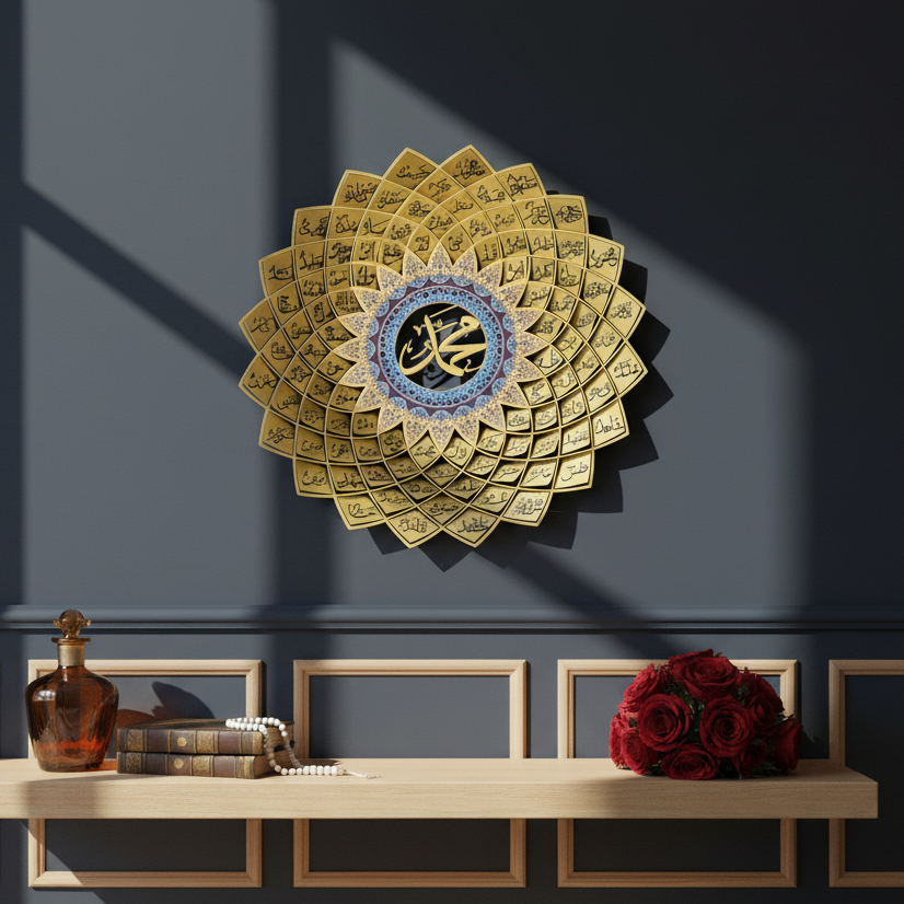 3D Gold Metal 99 Names of Prophet Muhammad (Asma un Nabi) Islamic Wall Art - Global Wall Art